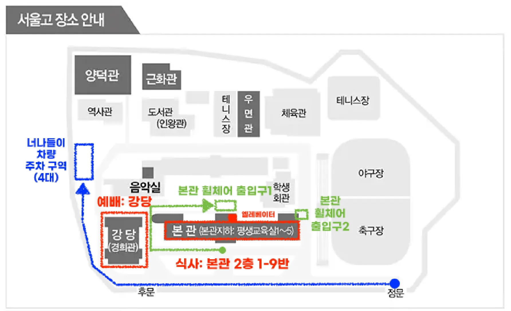 서울고 정문에서 주차안내부에 '너나들이'에 오셨다고 말씀하시면 안내해 드립니다. (역사관 옆 주차구역)
