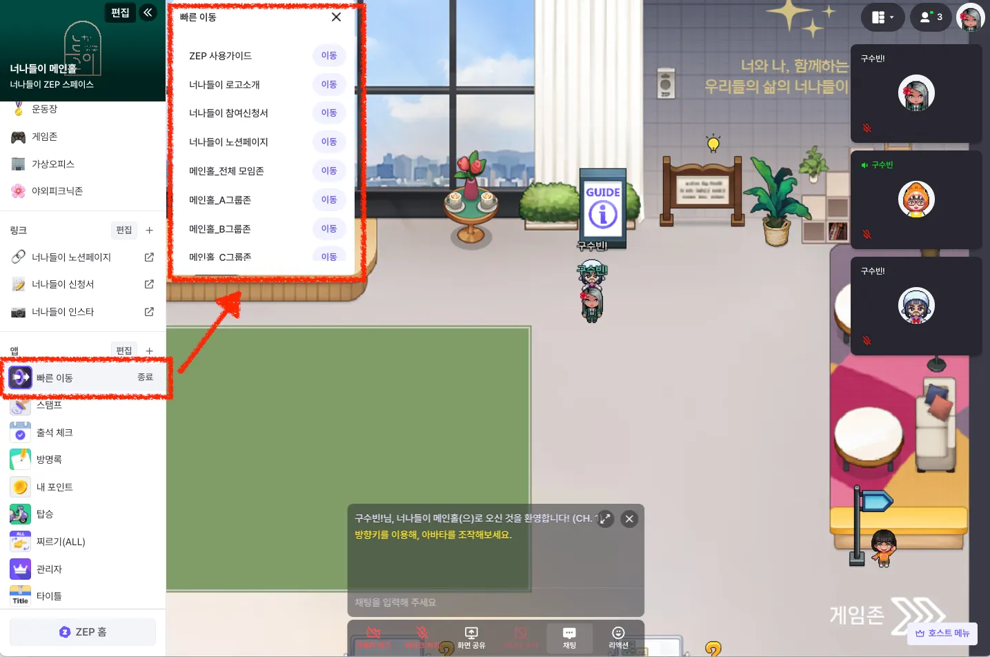 다른 공간 이동: 왼쪽 메뉴의 '이동'에서 원하는 공간 선택
